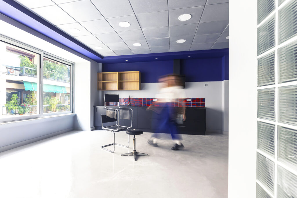 The deep ultramarine ceiling band became the guiding element of the design, a chromatic framework that unifies the rooms and subtly reshapes perception. Paired with neutral surfaces and a continuous floor, it allows the space to remain calm and adaptable, yet visually distinct. The kitchen area, with its black cabinetry, warm oak shelving, and dynamic red-and-blue tiles, acts as the project’s emotional core—simultaneously domestic, functional, and expressive.